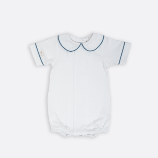 This 100% cotton white bodysuit features elegant blue piping, adding a subtle pop of color to a classic design. Soft and comfortable, it’s perfect for everyday wear or special occasions, making it a versatile addition to your baby’s wardrobe.