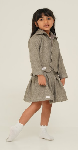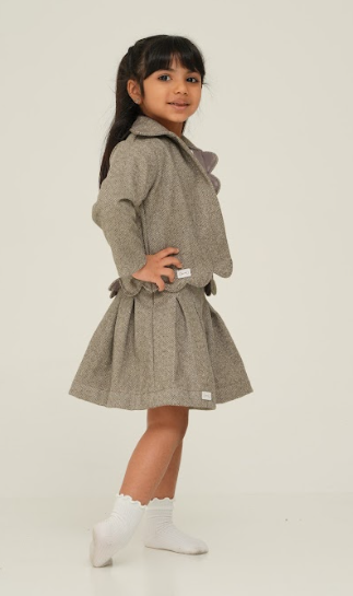Elegant and understated, the Pebble Set pairs a softly tailored jacket with a matching pleated skirt, crafted from textured beige fabric. With its gentle structure and classic charm, this ensemble embodies effortless sophistication — perfect for both special occasions and polished everyday wear.