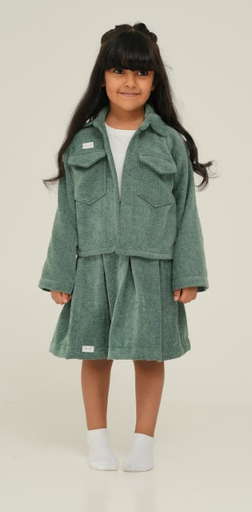 Soft, structured, and sophisticated — the Sage Set features a tailored green jacket paired with a matching pleated skirt. Crafted from textured fabric for comfort and elegance, it blends classic design with modern charm, perfect for every graceful occasion.