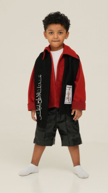 This refined ensemble features a deep red jacket paired with black leather shorts and an embroidered scarf showcasing heritage motifs inspired by postage stamps — a tribute to messages once sent with pride and unity.
