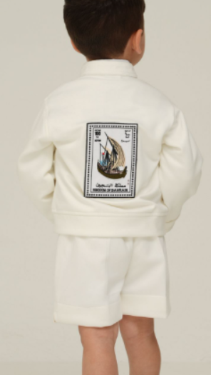 Crafted from soft, premium fabric, the set features a zip-up jacket paired with matching tailored shorts. The standout detail is the embroidered patch on the back — inspired by Bahrain’s vintage postage stamps, showcasing a traditional dhow, symbolizing the Kingdom’s rich maritime history.
