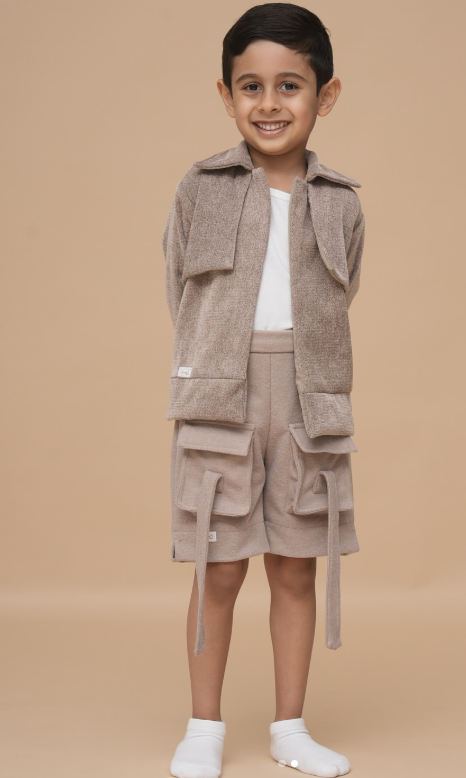 Charming and functional, the Explorer Set combines a tailored utility jacket with matching cargo-style shorts, both in soft beige hues. Designed for the curious and confident little one, it balances refined craftsmanship with playful practicality — perfect for stylish adventures.